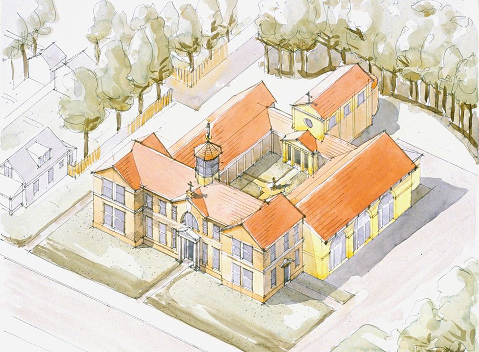 The 16,000-square-foot church will seat 675 people and feature traditional Catholic architecture with rounded arches, stained-glass windows, choir loft, baptistry, and twin towers bookending the main entrance.